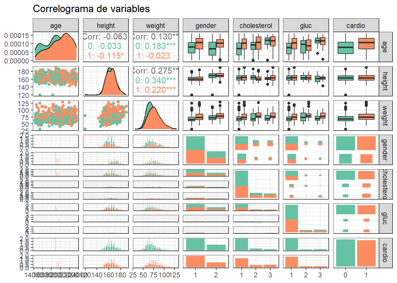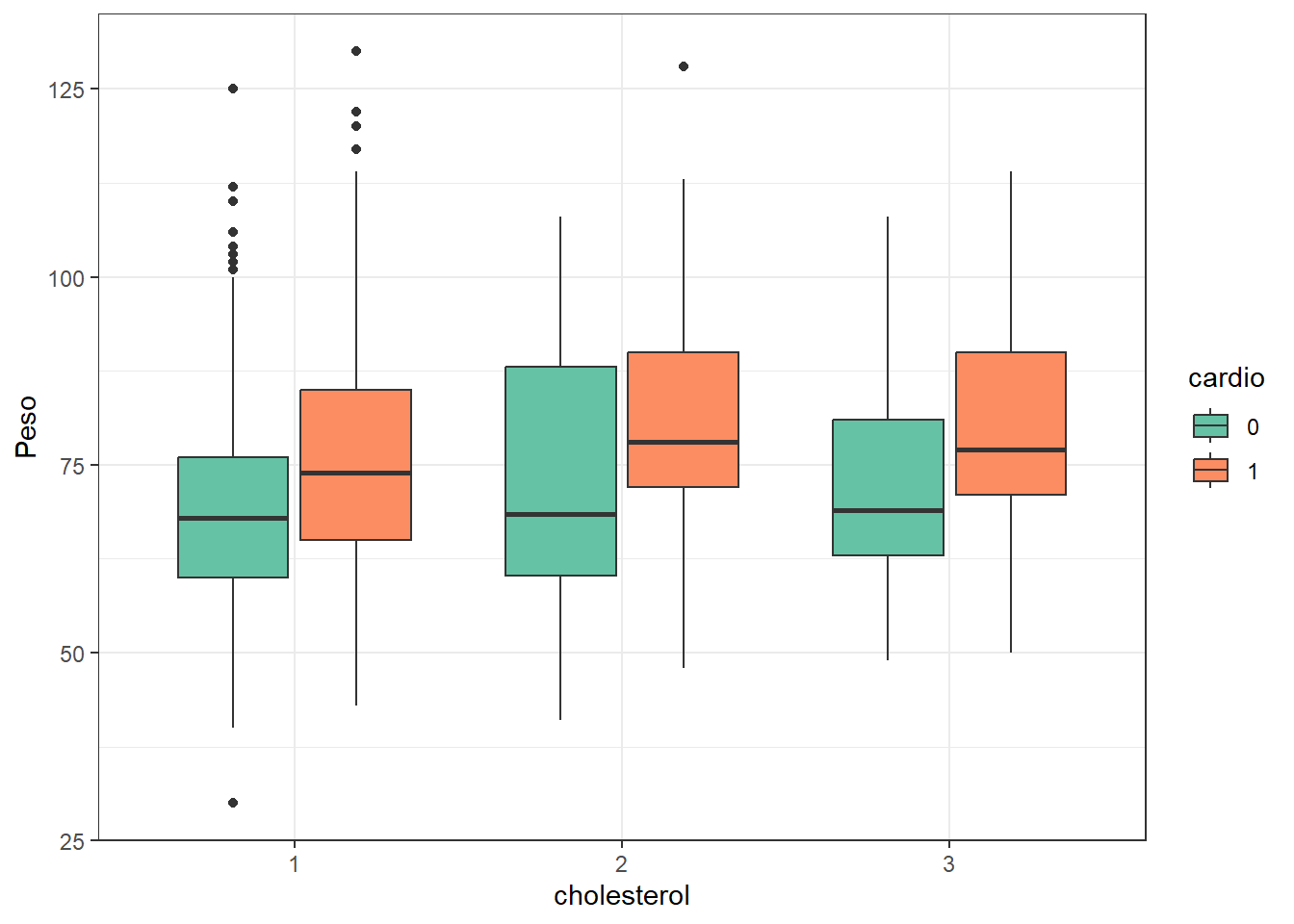 ggplot(train, aes(x = cholesterol, y = weight, fill =factor(cardio))) +geom_boxplot() +labs(x ="cholesterol", y ="Peso", fill ="cardio") +theme_bw() +scale_fill_brewer(palette="Set2")