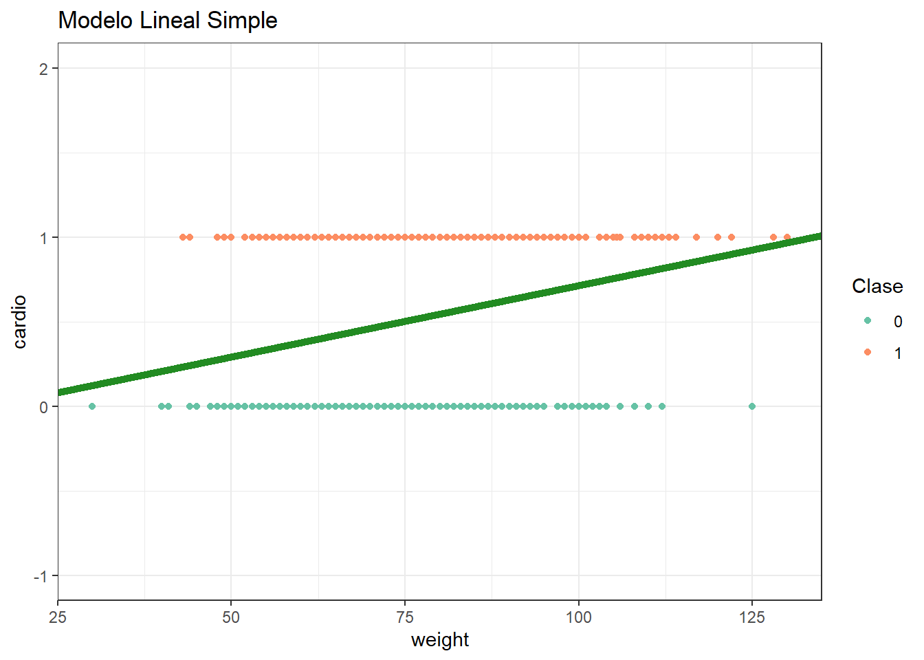 ---title: "Regresión Logística"author: "Pamela Eugenia Pairo"lang: esformat: html: theme: flatly code-fold: show code-tools: true toc: true toc-location: left---```{r, echo=TRUE, message=FALSE, warning=FALSE}knitr::opts_chunk$set(warning = FALSE, message = FALSE)# Cargamos las librerías que vamos a utilizarlibrary(tidyverse)library(tidymodels)library(modelr)library(GGally)library(pROC)library(cowplot)library(OneR)library(rlang)library(caret)set.seed(15)```# Presentación del caso de estudioVamos a trabajar con una base de datos extraída de [Kaggle](https://www.kaggle.com/code/robinreni/cardiovascular-disease-eda-detailed/notebook). Es una base de datos que consiste de 69301 registros de pacientes a los que se les registró 12 caracteristicas asociadas a una enfermedad cardiovascular.El objetivo de esta clase es utilizar diferentes modelos de regresión logística para predecir la presencia o ausencia de enfermedad cardiovascular (ECV) utilizando los resultados del examen del paciente.**Descripción de los datos**- Age: edad del paciente (días)- Height: altura del paciente (cm)- Weight: peso del paciente (kg)- Gender: sexo biológio del paciente (1: mujer, 2:varón)- Systolic blood pressure: Presión arterial sistólica- Diastolic blood pressure: Presión arterial diastólica- Cholesterol: colesterol en sangre del paciente (1: normal, 2: por encima de lo normal, 3: muy por encima de lo normal)- Glucose: glucosa (1: normal, 2: por encima de lo normal, 3: muy por encima de lo normal)- Smoking: fuma/no fuma- Alcohol intake: consume alcohol/ no consume alcohol- Physical activity; realiza actividad física/ no realiza actividad física- Cardiovascular disease: variable target (0:no, 1:si)```{r}df <-read.csv("cardio_train.csv", sep =";")colSums(is.na(df))# chequeamos si hay datos faltantes``````{r}sum(duplicated(df))#chequeamos duplicados``````{r}glimpse(df)```# Creación de base de datosSe genera una muestra de tamaño 1000 con la que se realizaran los análisis y se analiza si hay desbalance en la variable respuesta.```{r}df <- df %>%sample_n(1000)df %>%group_by(cardio) %>%summarise(cnt =n()) %>%mutate(freq =round(cnt /sum(cnt), 2))```## Partición de la base de datos```{r}df_split <-initial_split(df,prop =0.8)train<- df_split %>%training()test <- df_split %>%testing()# Número de datos en trainpaste0("Total del dataset de entrenamiento: ", nrow(train))```Analizamos cómo quedo el balance de clases para `cardio` en cada dataset.```{r}# calculamos la distribución de clase en cada datasettrain_ <- train %>%group_by(cardio) %>%summarise(numero_casos=n()) %>%mutate(prop =round(prop.table(numero_casos)*100,2))test_ <- test %>%group_by(cardio) %>%summarise(numero_casos=n()) %>%mutate(prop =round(prop.table(numero_casos)*100,2))# armamos tabla conjunta para graficardistrib =cbind(rbind(train_, test_), dataset =c("train", "train", "test", "test"))# graficamos las distribucionesggplot(distrib, aes(x = cardio, y = prop, fill =factor(cardio), label = prop)) +geom_bar(stat="identity", position ="dodge") +facet_wrap(~ dataset) +theme(axis.text.x =element_text(angle =90, hjust =1)) +labs(x ="", y ="Proporción en %", title ="Proporción de cardio por dataset") +guides(fill=guide_legend(title="cardio"))+theme_bw() +scale_fill_brewer(palette="Set2")``````{r}glimpse(train)```Seleccioamos las variables con las que vamos a trabajar y les asignamos el tipo de dato correspondiente.```{r}cols <-c("age", "height", "weight", "gender", "cholesterol","gluc","cardio")train$gender <-as.factor(train$gender)train$cholesterol <-as.factor(train$cholesterol)train$gluc <-as.factor(train$gluc)test$gender <-as.factor(test$gender)test$cholesterol <-as.factor(test$cholesterol)test$gluc <-as.factor(test$gluc)``````{r}# graficamos con ggpairs coloreando por variable a predecirg <- train %>%mutate(cardio =factor(cardio)) %>%select(all_of(cols)) %>%ggpairs(title ="Correlograma de variables",mapping =aes(colour= cardio),progress =FALSE, lower=list(combo=wrap("facethist", binwidth=0.8))) +theme(axis.text.x =element_text(angle =90, hjust =1)) +theme_bw() +scale_fill_brewer(palette="Set2") +scale_color_brewer(palette="Set2")g```# Regresión linealEn este caso estamos modelando la probabilidad de la siguiente manera: $P(X)= \beta_0 + \sum\limits_{j=1}^p \beta_j X_j$Veamos que tan bueno es el modelo lineal para esto, usando el peso como predictor.```{r}mrl <- train %>%lm(formula = cardio ~ weight) tdy = mrl %>%tidy() tdymrl %>%glance()```Los estimadores son significativos y el test de significatividad global del modelo también es significativo.Veamos un gráfico de nuestro modelo.```{r, echo=FALSE}ggplot(train, aes(weight, cardio)) + geom_point(aes(color=factor(cardio))) + scale_color_brewer(palette = "Set2") + geom_abline(intercept = tdy$estimate[1], slope = tdy$estimate[2], color='forestgreen', size=2) + labs(title="Modelo Lineal Simple", color='Clase') + lims(y=c(-1,2))+ theme_bw()```Parece tener bastantes problemas para estimar la probabilidad de supervivencia de los individuo: no existe un punto de corte claro, la predicción podría ser mayor a 1 o menor a cero llegado el caso.# Recap de Regresión Logística## **Odds**Cociente entre la probabilidad de éxito de un evento y la probabilidad de que no ocurra.$Odds = \frac{P(x)}{1-P(x)}$Ej. si _Odds_ es 3 indica que por cada 4 repeticiones del evento se espera que ocurran 3 y que una no ocurra.Odds < 1 : es mas probable que no ocurra a que siOdds = 1 : equiprobabilidadOdds > 1: es mas probable que el evento ocurra a que no.En nuestro caso:$Odds = \frac{391/800}{409/800}= 0.9558 \approx \frac{191}{200}$Por cada 191 pacientes con ECV, 200 no la tienen.## **Logit**$Logit = \log {\frac{P(x)}{1-P(x)}}= \log Odds$## **_Odds Ratio_ (OR)**Es una medida de magnitud de efecto. Si tenemos el siguiente modelo de regresión logística$\log\left(\frac{p}{1 - p}\right) = \beta_0 + \beta_1 X$El odds ratio asociado a la variable $\ X$ es:$\text{OR} = e^{\beta_1}$OR = 1 No hay efectoOR > 1 asociac