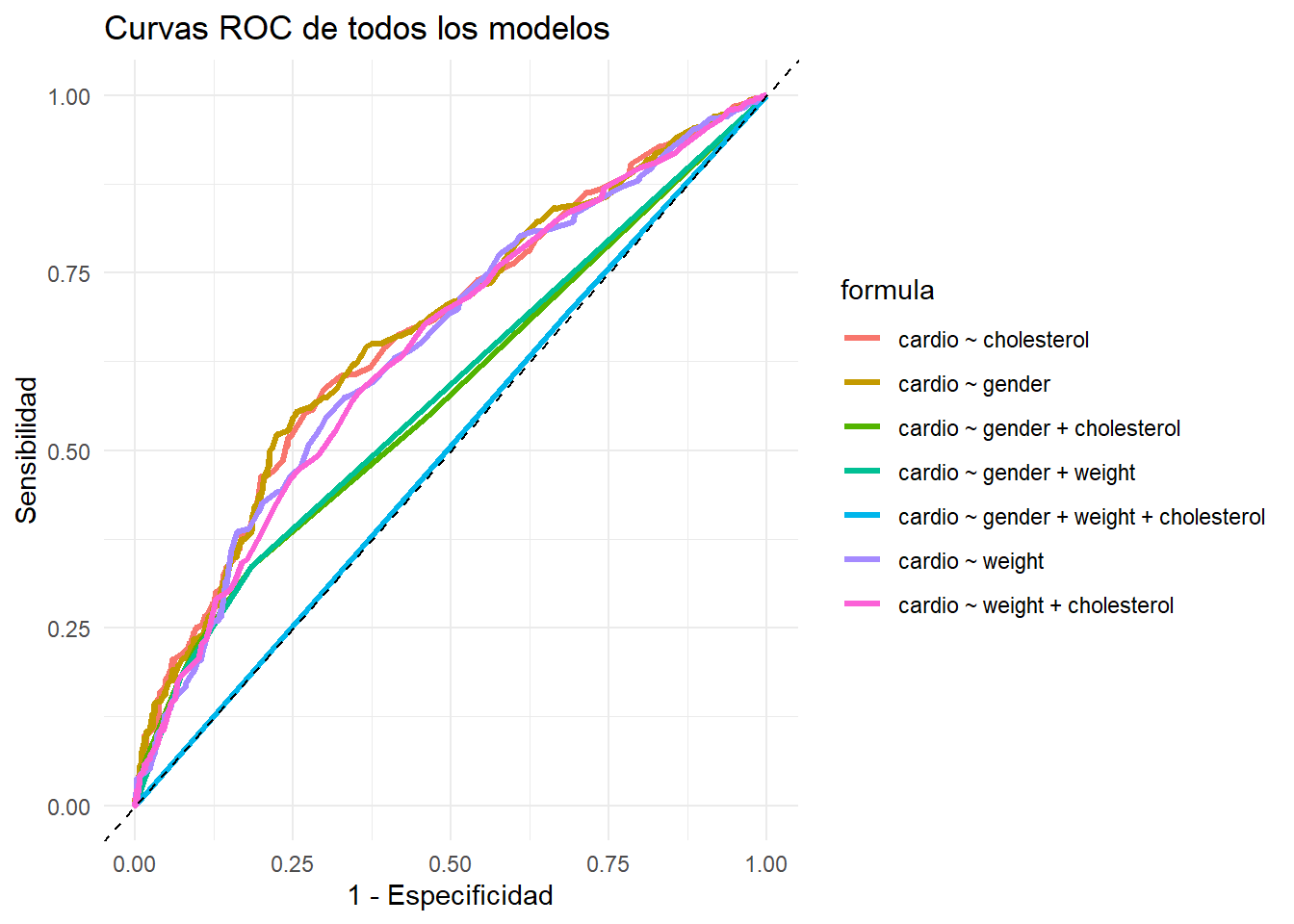 vars <-c("gender", "weight", "cholesterol")# Crear todas las combinaciones posibles de predictorescombs <-unlist(lapply(1:length(vars), function(i) combn(vars, i, simplify =FALSE)),recursive =FALSE)# Crear una lista de fórmulasformulas <-map(combs, ~reformulate(termlabels = .x, response ="cardio"))formulas