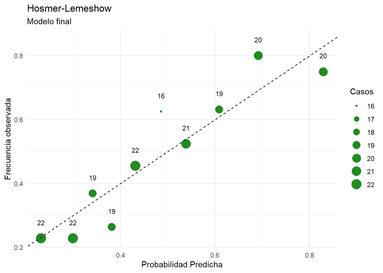Aquellos círculos que se ubiquen por encima de la línea punteada indican que el modelo está subestimando la probabilidad para dichos grupos. Mientras que si los círculos se ubican por debajo el modelo está sobreestimando la probabilidad para dichos grupos.