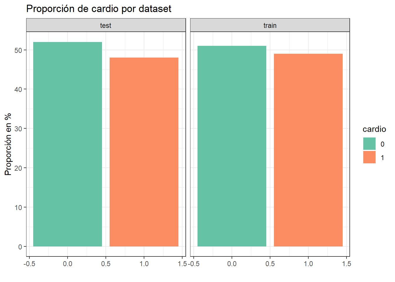 # calculamos la distribución de clase en cada datasettrain_ <- train %>%group_by(cardio) %>%summarise(numero_casos=n()) %>%mutate(prop =round(prop.table(numero_casos)*100,2))test_ <- test %>%group_by(cardio) %>%summarise(numero_casos=n()) %>%mutate(prop =round(prop.table(numero_casos)*100,2))# armamos tabla conjunta para graficardistrib =cbind(rbind(train_, test_), dataset =c("train", "train", "test", "test"))# graficamos las distribucionesggplot(distrib, aes(x = cardio, y = prop, fill =factor(cardio), label = prop)) +geom_bar(stat="identity", position ="dodge") +facet_wrap(~ dataset) +theme(axis.text.x =element_text(angle =90, hjust =1)) +labs(x ="", y ="Proporción en %", title ="Proporción de cardio por dataset") +guides(fill=guide_legend(title="cardio"))+theme_bw() +scale_fill_brewer(palette="Set2")